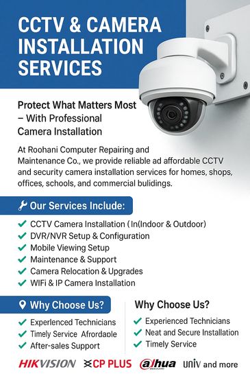 At Roohani Computer Repairing and Maintenance Co., we provide reliable and affordable CCTV and security camera installation services for homes, shops, offices, schools, and commercial buildings.